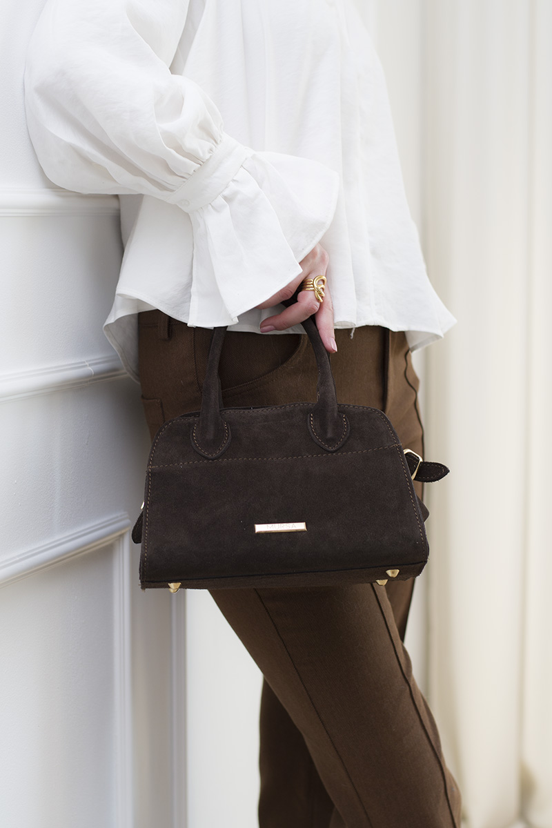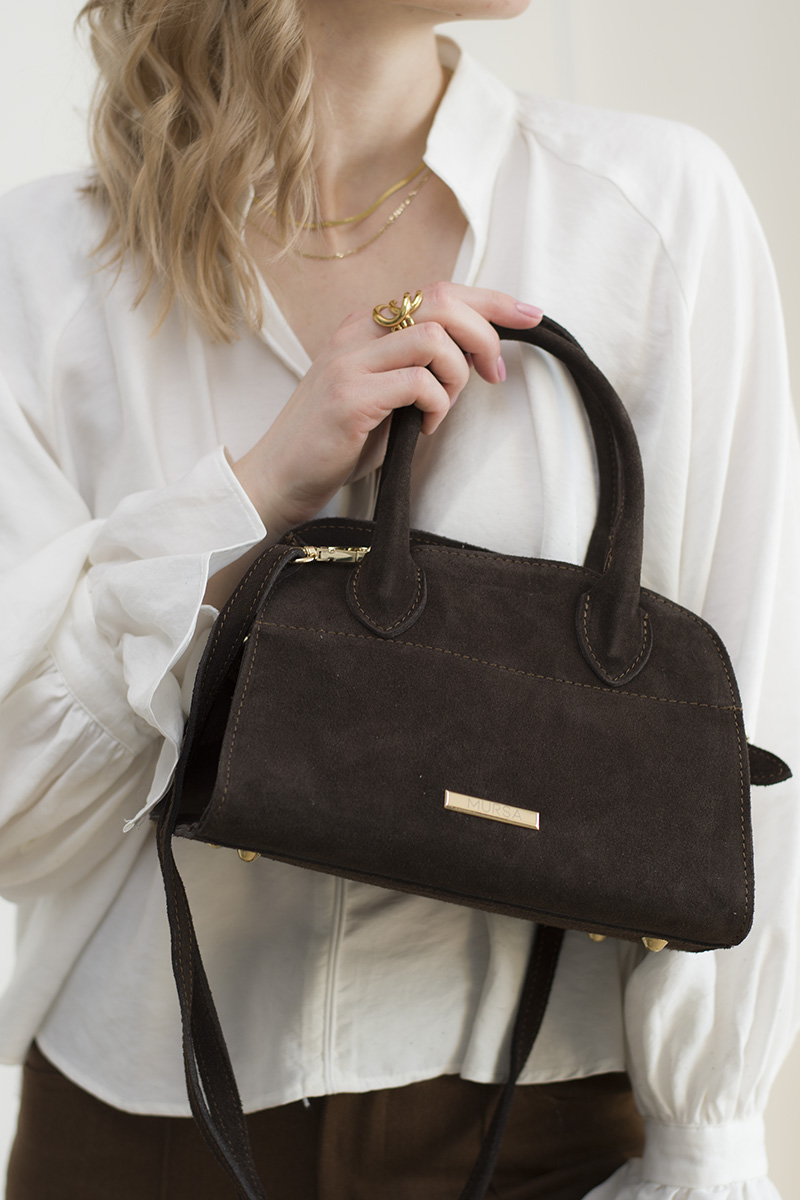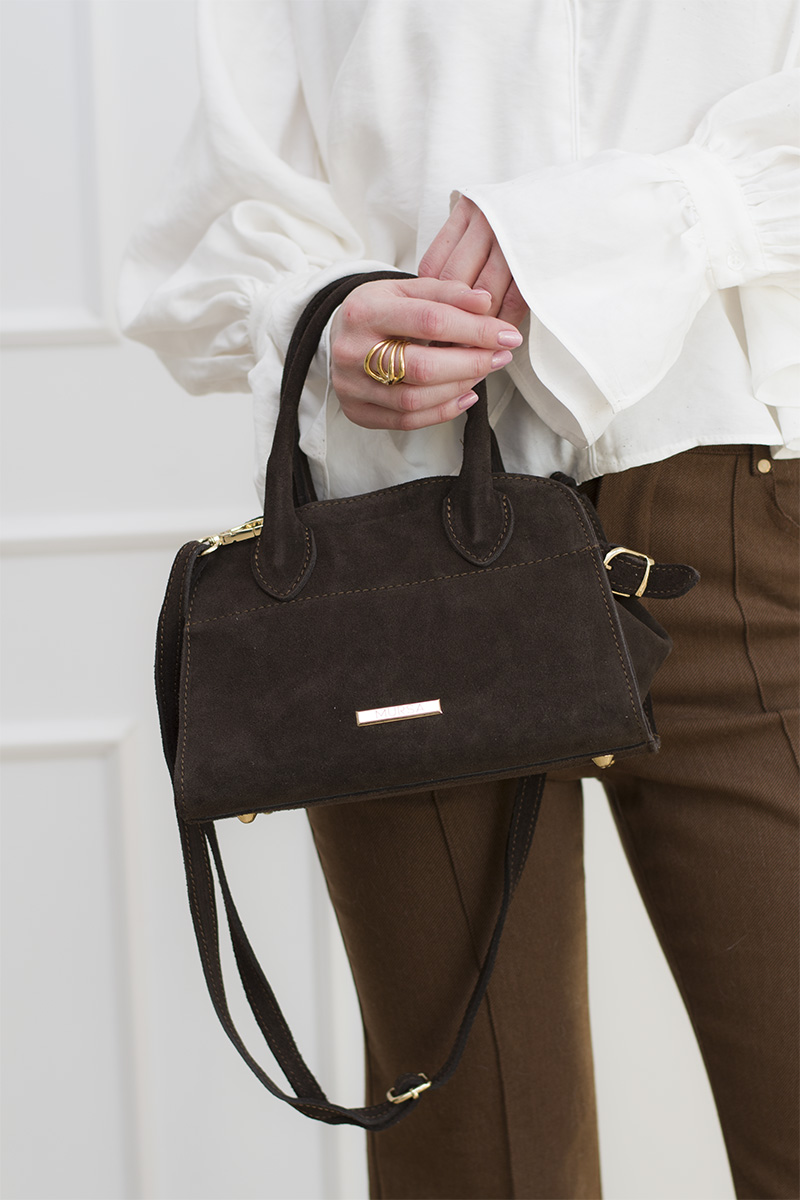 Naturalny zamsz w ciepłym, czekoladowym odcieniu w połączeniu ze złotymi okuciami tworzy elegancką, dopracowaną całość, która pięknie dopełni zarówno minimalistyczne, jak i bardziej kobiece stylizacje.